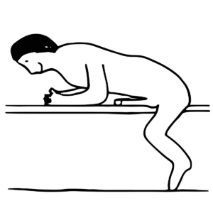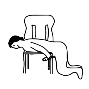 Man legt sich auf einen Stuhl, so dass der Kopf vorn herüber schaut und der Penis unter dem Stuhl “verschwindet”. Mit der Hand wird der Penis gerieben.
