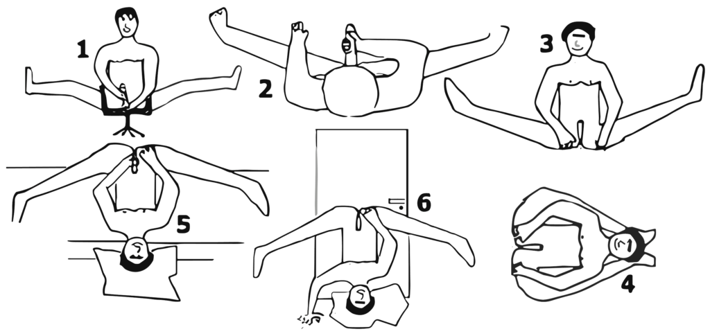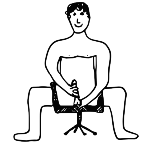 Nötig ist ein Stuhl mit großen Armlehnen. Ein Bürostuhl ist dafür beispielsweise geeignet. Die Beine werden mit einer Portion Artistik hinter bzw. in die Armlehnen getan, so dass die Beine so weit wie möglich gespreizt sind. Wer merkt, dass er nicht gelenkig genug ist: Aufhören! Ansonsten den Penis vor- und zurückreiben.