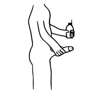Variation: Statt dem Untergriff einen Obergriff verwenden. Soll heißen: Die Handfläche statt unterhalb des Penis, oberhalb haben (und den Daumen zum Körper hin).